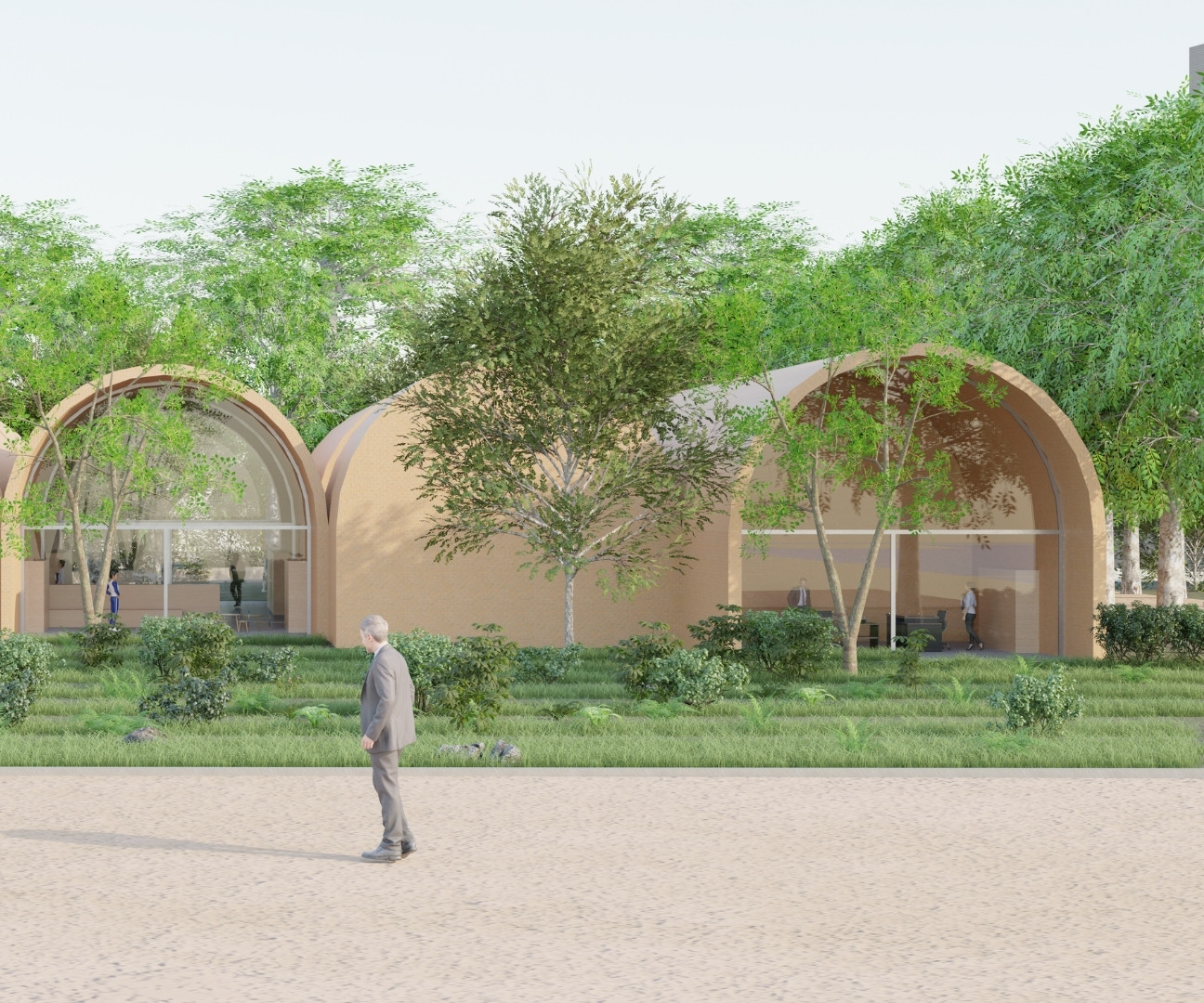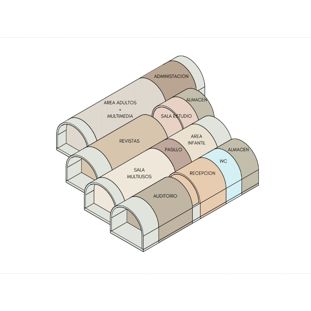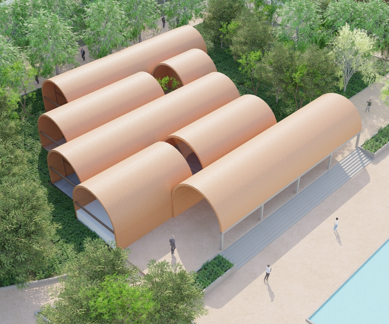 Moreover, the proposal is composed of five vaulted volumes that integrate organically with the park’s natural surroundings. Each of them contributes to creating a fluid path that connects the interior and exterior. Likewise, one of the vaults transforms into an open pergola that invites visitors to enter the building. In this way, the architectural gesture symbolizes the union between knowledge and landscape.