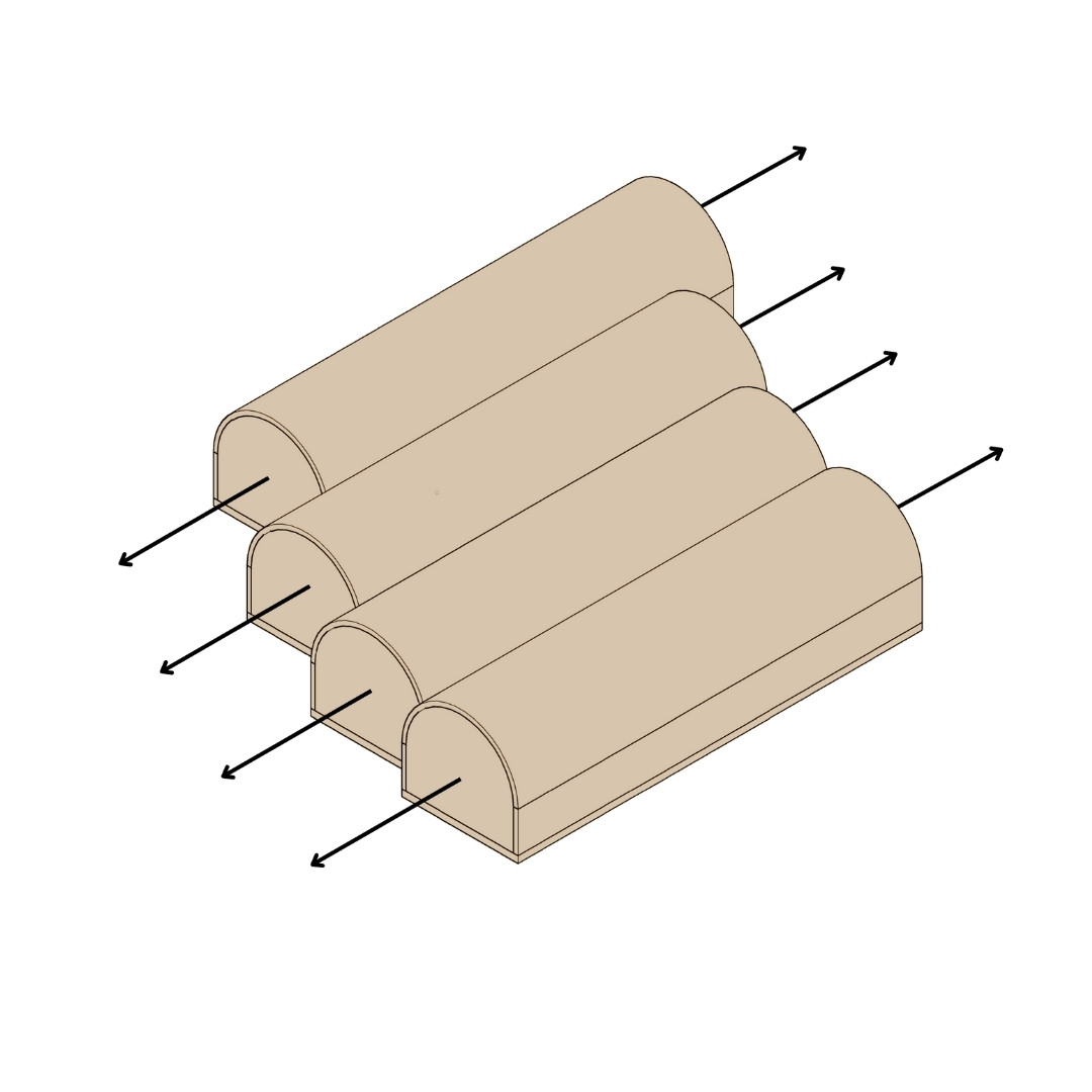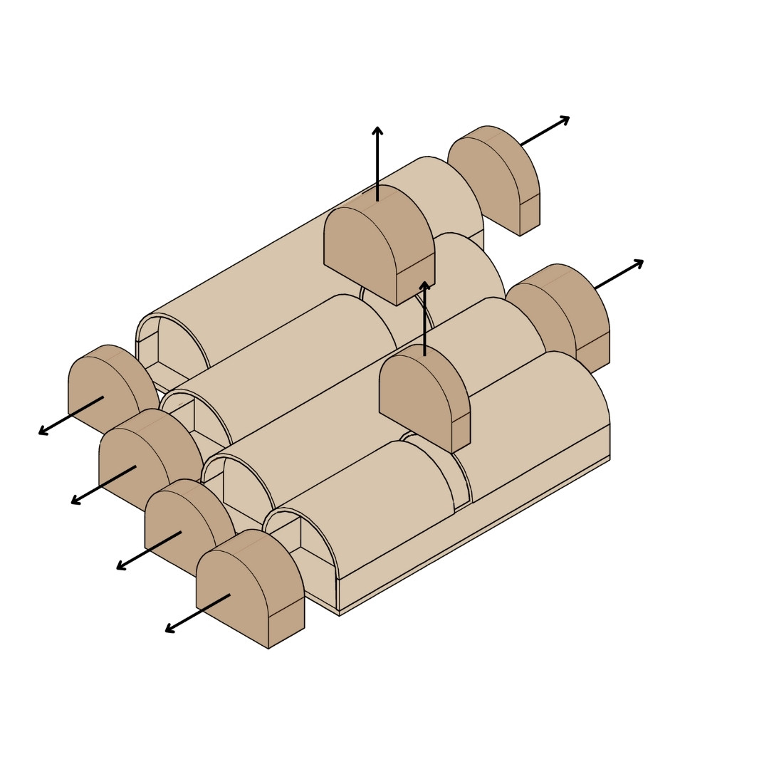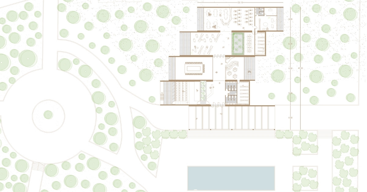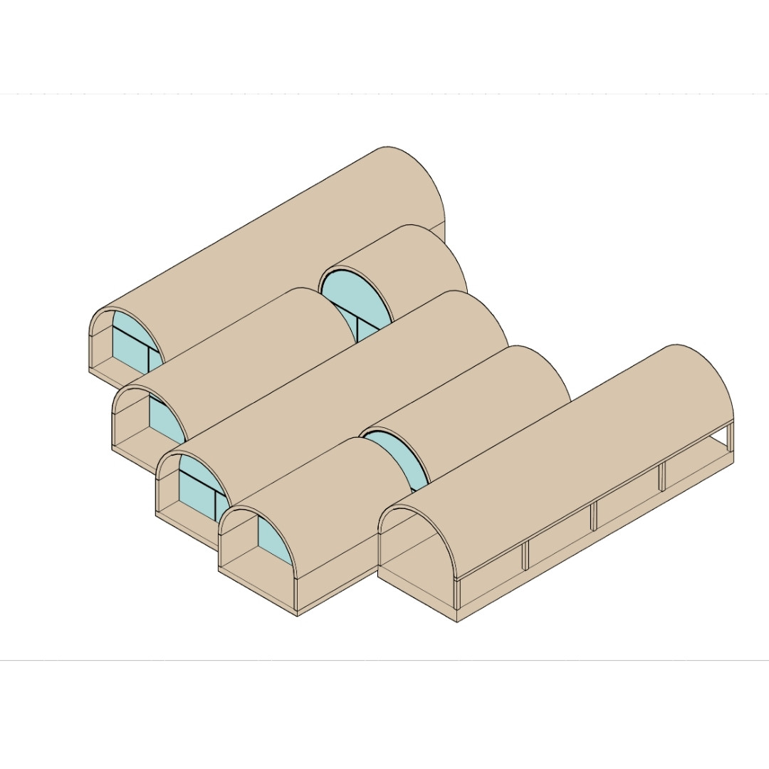 Moreover, the proposal is composed of five vaulted volumes that integrate organically with the park’s natural surroundings. Each of them contributes to creating a fluid path that connects the interior and exterior. Likewise, one of the vaults transforms into an open pergola that invites visitors to enter the building. In this way, the architectural gesture symbolizes the union between knowledge and landscape.